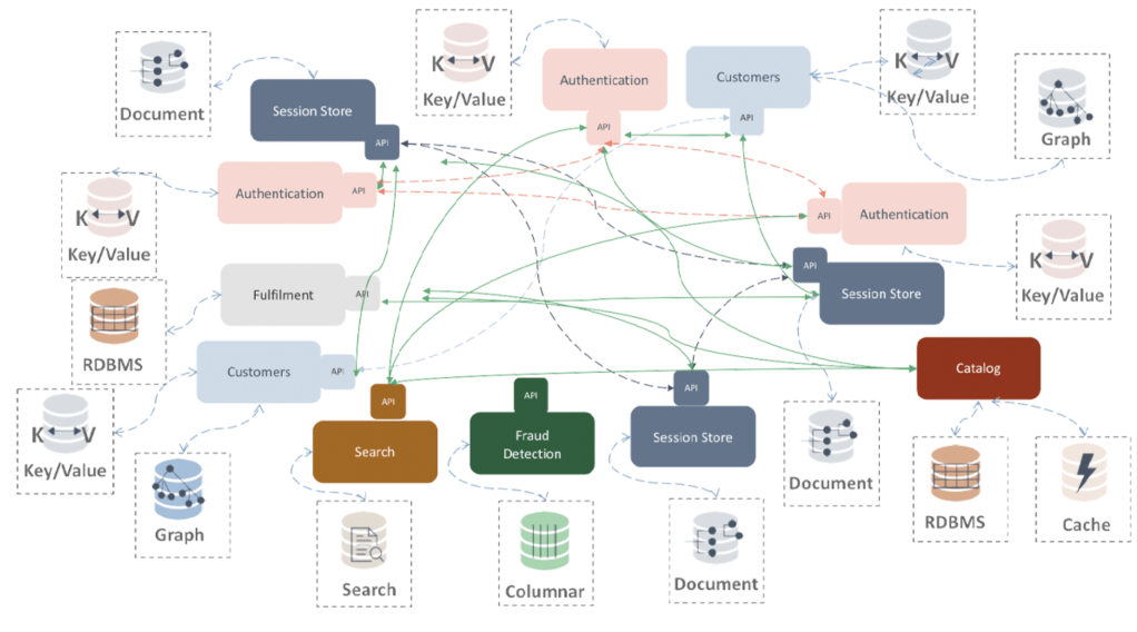 Pada umumnya dalam microservice sistem sangat di sarankan apabila satu database di manage oleh satu microservice. Komunikasi antar database biasanya dilakukan melalui komunikasi antar service. Dengan demikian, satu database akan berkomunikasi dengan database lainnya melalui sebuah API yang sudah terdefinisi dengan baik..